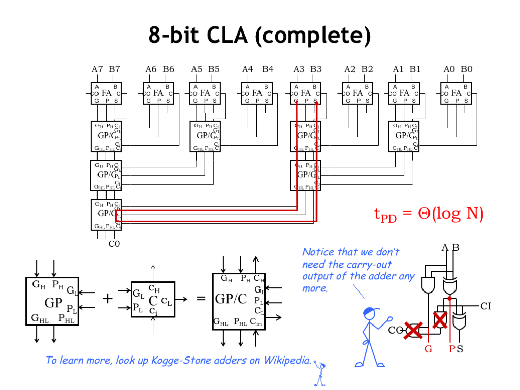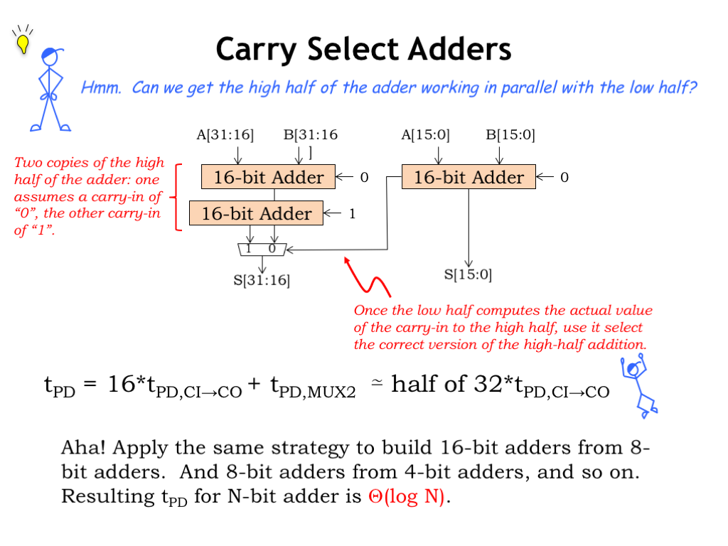 现在将一个32位的加法器分成两个16位的部分分别计算再组合,$t_{PD}$就差不多减小了一半。