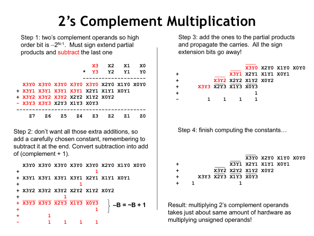 就是普通的竖式乘法,但是要注意如果值是补码,那最高位的全值为$-2^{N-1}$而不是$2^{N-1}$。