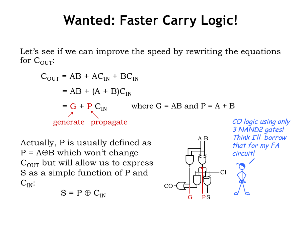 从$C_{out}$的计算公式中可以看出,一个FA的输入可以转换成3个变量$P$,$G$和$C_{in}$ ,其中只有$C_{in}$需要该位的前一位的$C_{out}$。