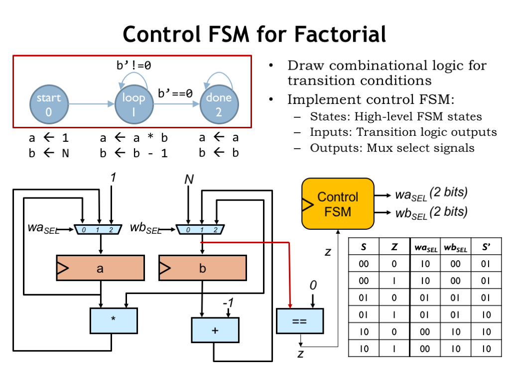 上图虽然实现了a和b的计算,但还不能控制其状态,即不能在b为0时结束循环,所以需要一个FSM来控制整个计算电路即datapath的状态。