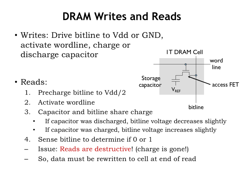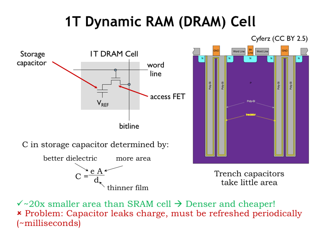 DRAM是使用电容来保持电压,体积更小,所以容量更大,但访问速度比SRAM慢,而且需要定时刷新存储的数据。