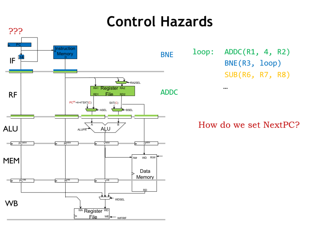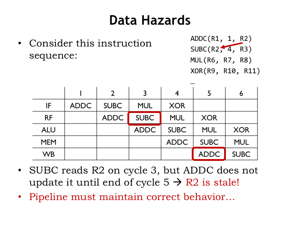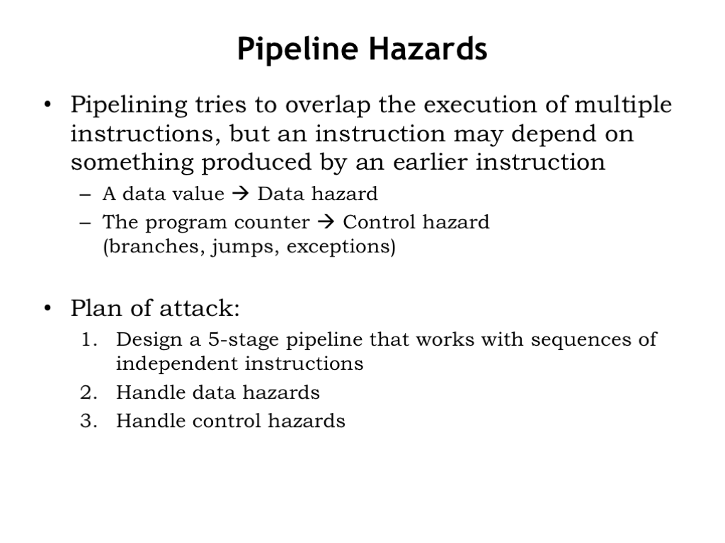常见的冲突有两种,即数据冲突和控制逻辑冲突. 数据冲突是指当前指令需要的数据暂时还没有写回寄存器或者内存, 控制逻辑冲突是指当要跳转的指令的地址还没计算出来时, 下一个指令的地址应该是多少.