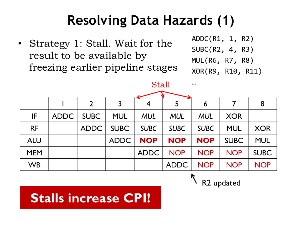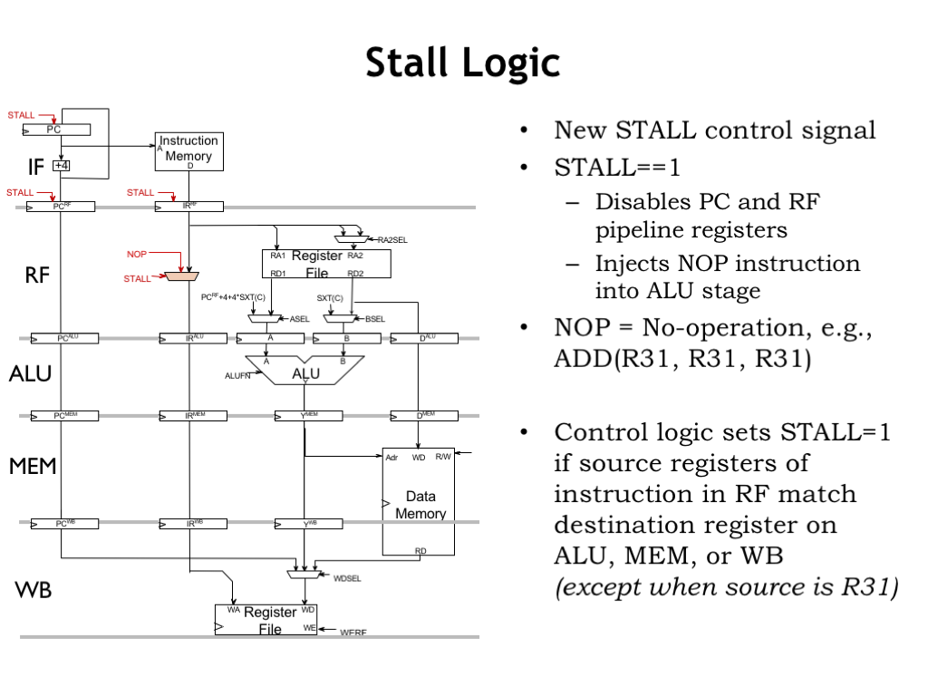 Stall就是当指令运行到流水线的某一个阶段时, 如果检测到需要的数据还没有写回寄存器或者内存, 就在这个阶段阻塞住, 而且前面阶段的指令也要同时阻塞住, 阻塞的同时给下一阶段的IR寄存器输出NOP.