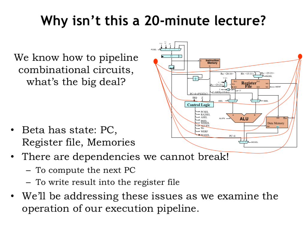 本章主要是讲如何讲前面做的Beta cpu流水线化, 以及如何解决流水线中会遇到的数据冲突/控制逻辑冲突等等.