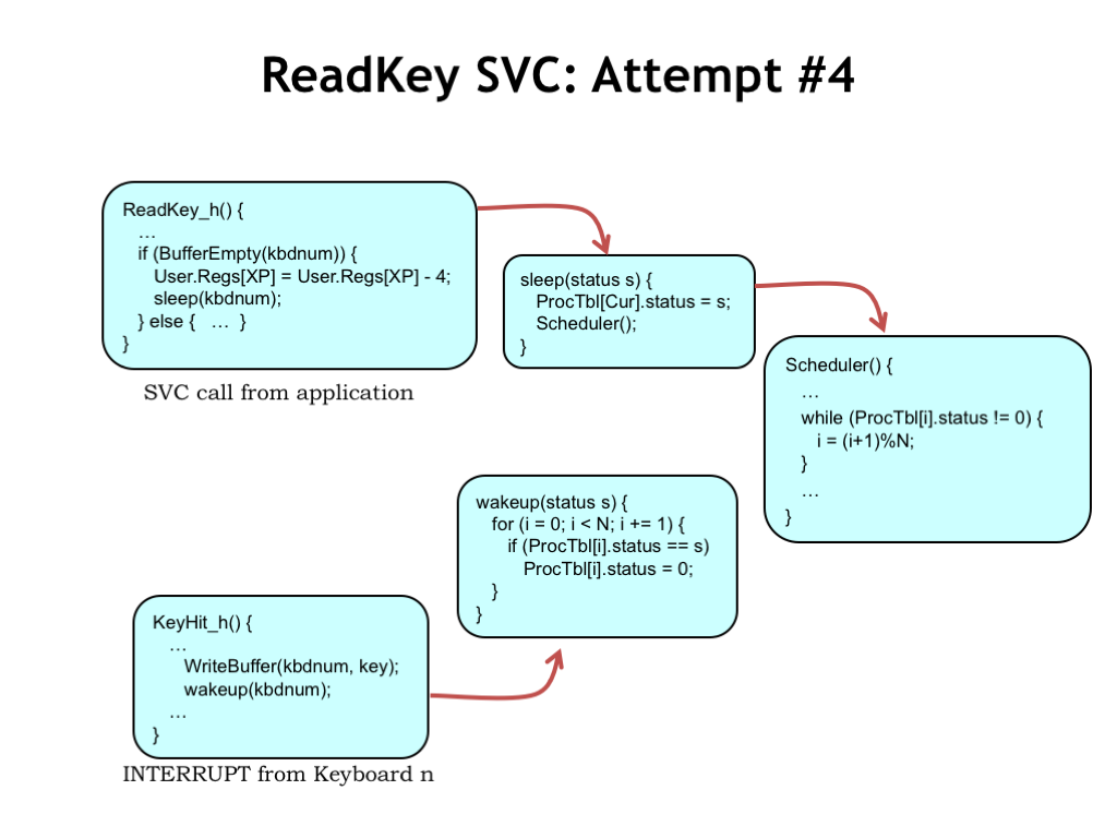 当进程开始等待IO时, 便用 sleep(id) 来改变进程的状态, 其中 id 相当于这个IO资源的标识符, 比如可以有多个进程都在等待键盘的输入. 当相应的IO时间响应后, 再根据这个id去恢复进程的状态.